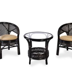 Комплект из натурального ротанга, состоящий из дивана, двух кресел и круглого столика со стеклом.